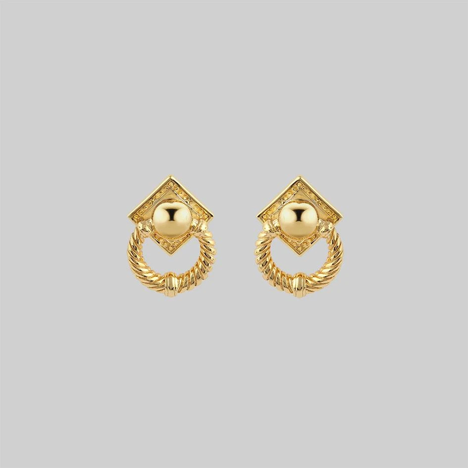 Delicate but grand door knocker style Gold stud earrings.
