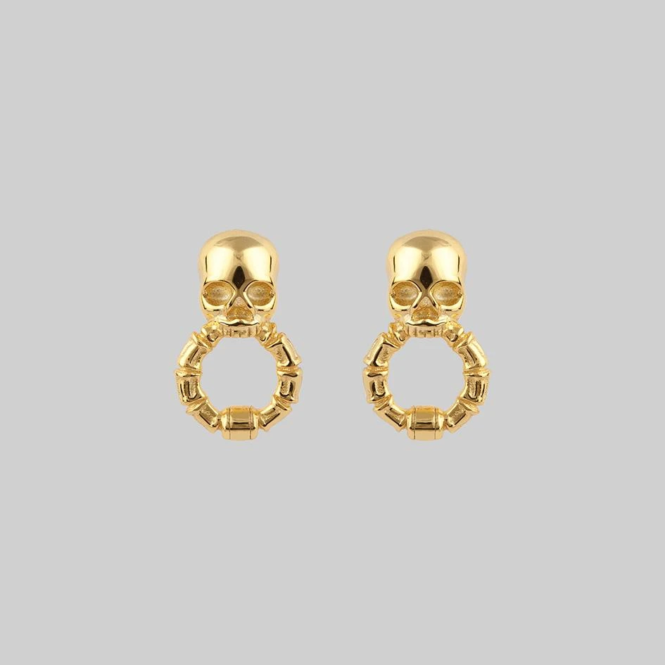 Scary or Cute? We can’t decide! Detailed gold skull & bone door knocker style stud earrings.