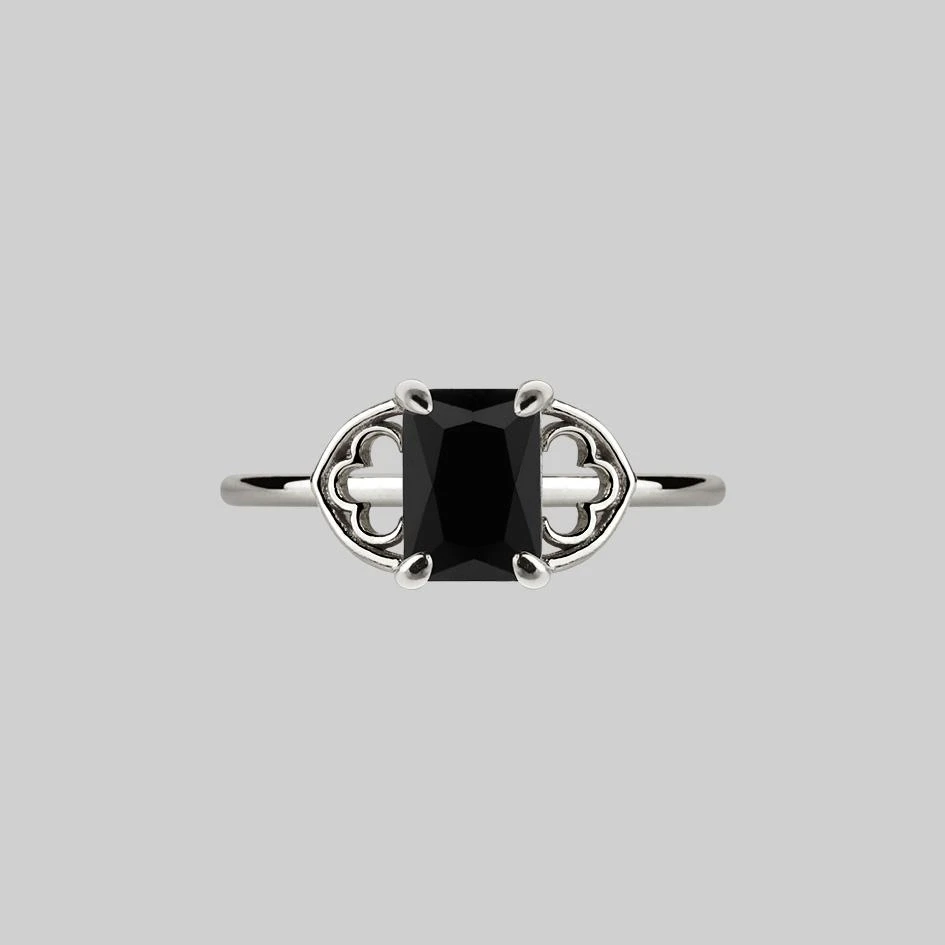 An elegant gothic style ring featuring tracery Cathedral detail shoulders either side of a Black Onyx rectangle cut gemstone.