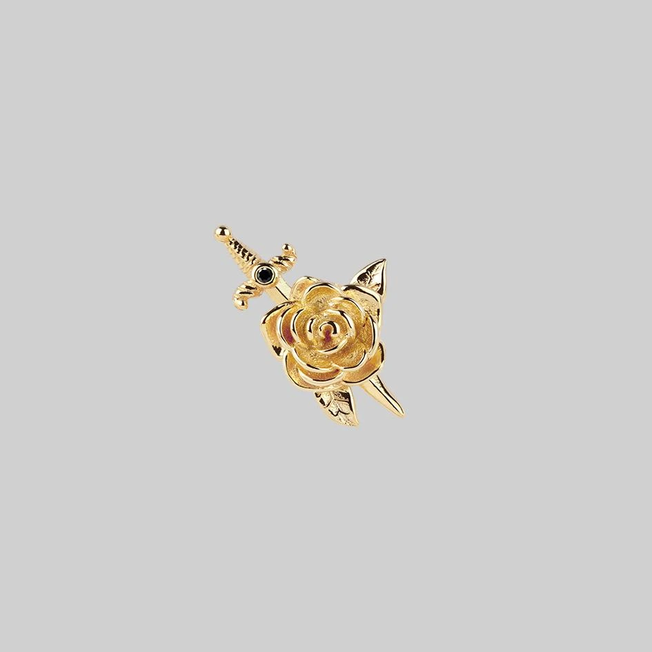 Dangerously detailed rose and dagger ear stud featuring a tiny Black Spinel gemstone.