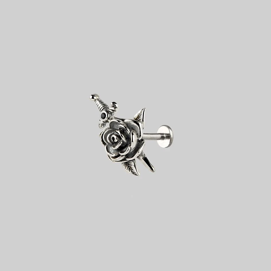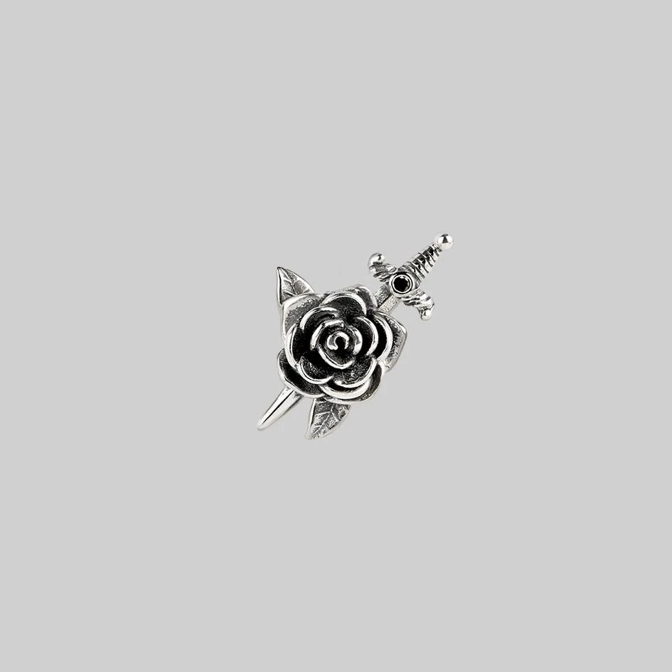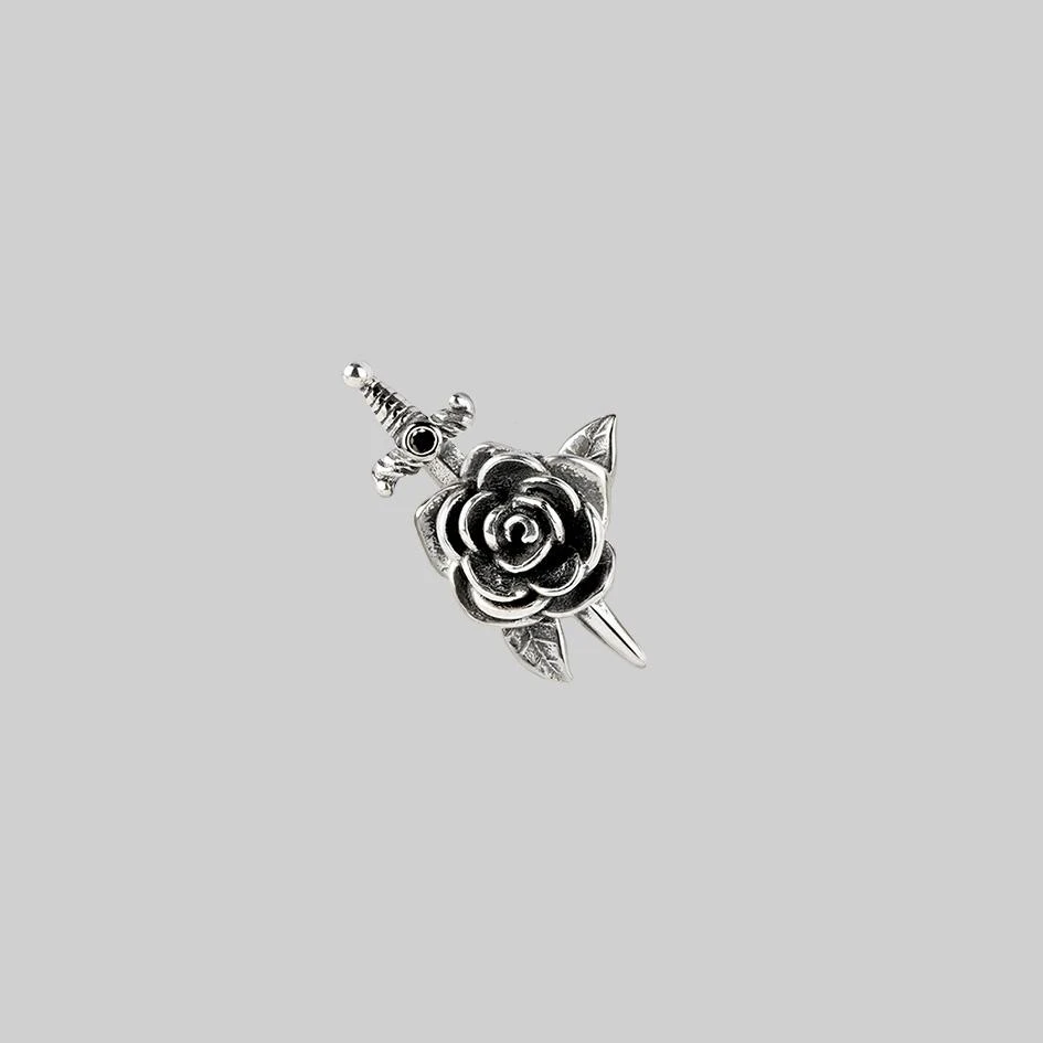 Dangerously detailed rose and dagger ear stud featuring a tiny Black Spinel gemstone.