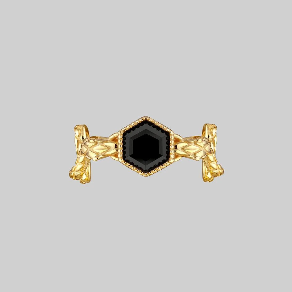 Two deadly coiled snake heads with rings hold a bezel set hexagon cut Onyx gemstone.