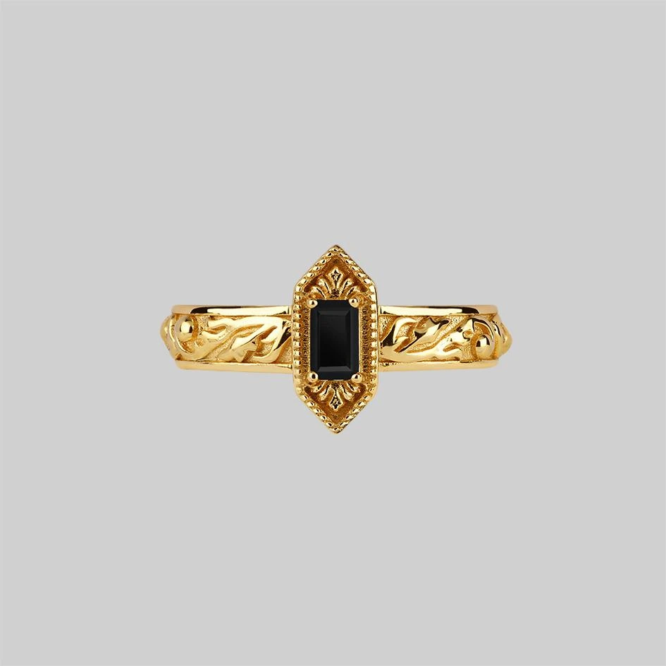 Detailed medieval style ring inspired by Gothic Architecture features a central Black Onyx gemstone.