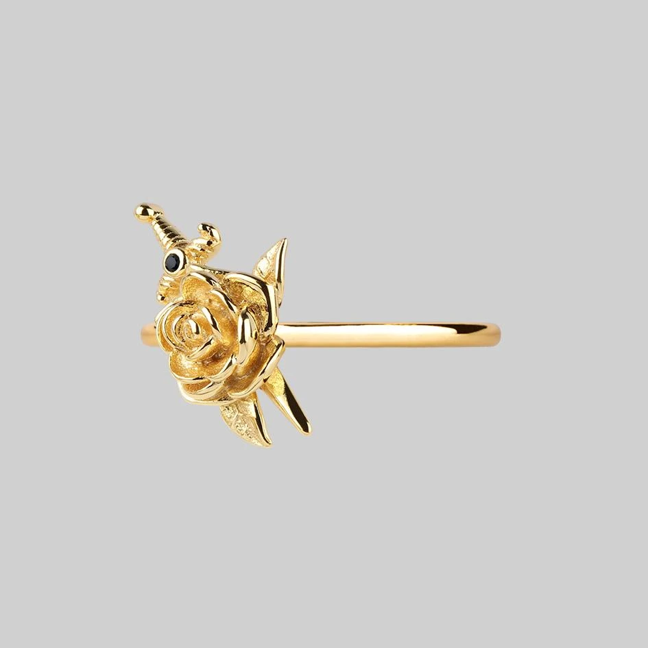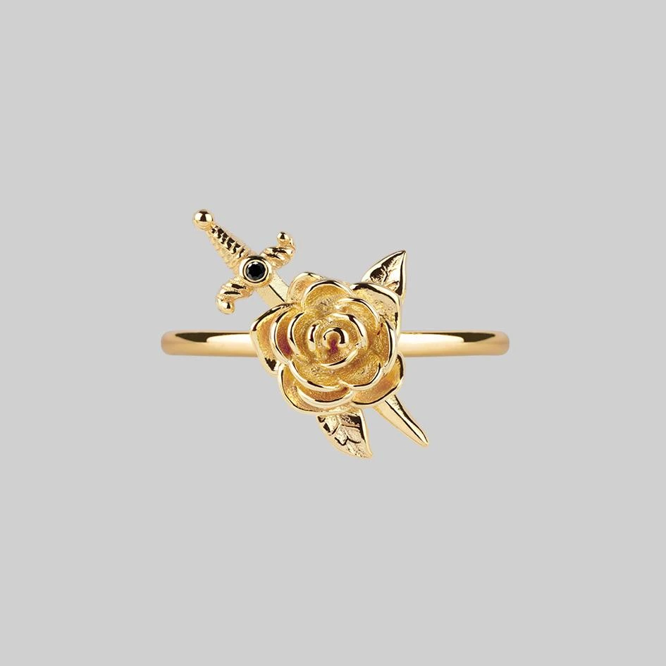 Dangerously detailed rose and dagger Gold ring.