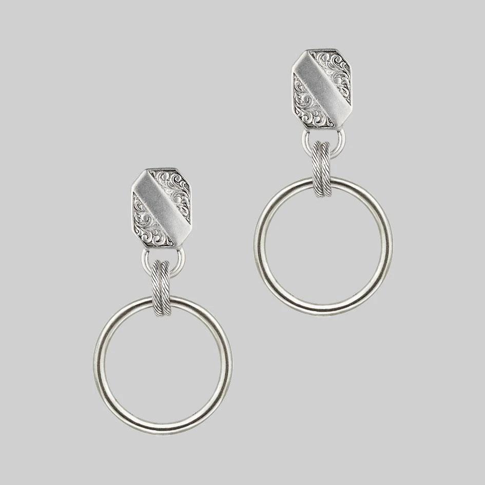 Ornate shield and ring stud earrings.