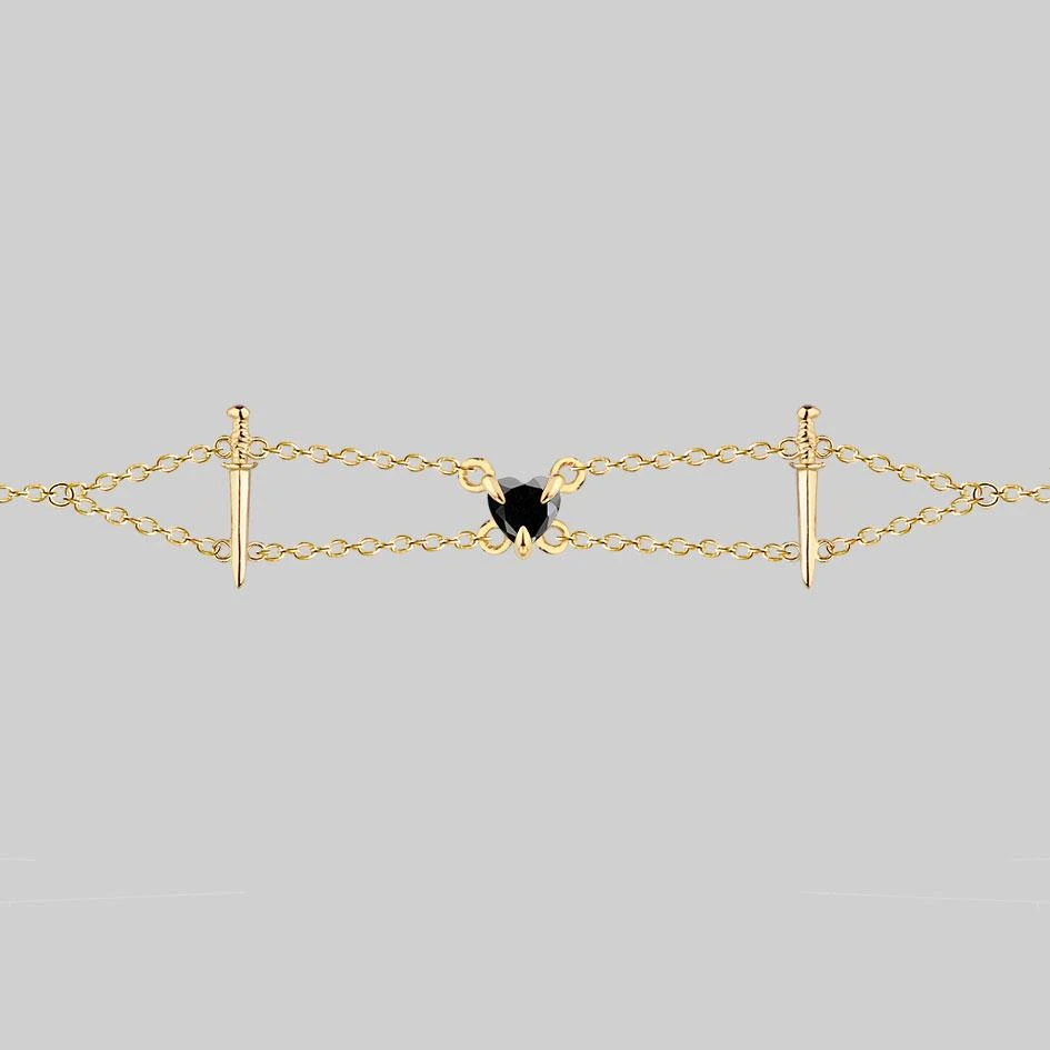 Delicate gold chain choker featuring a central Black Onyx Heart defended by two swords.