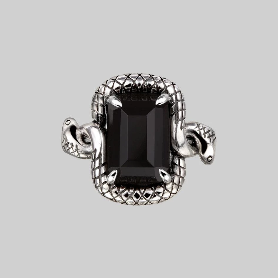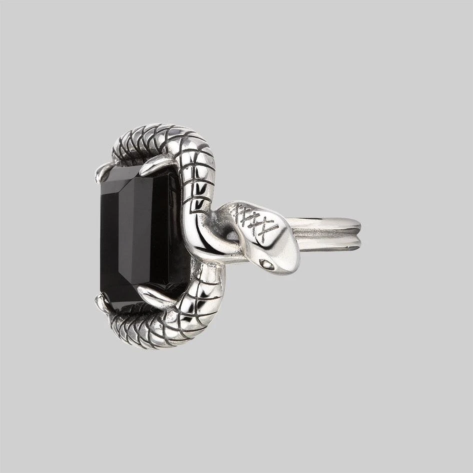 Two venomous snakes twist and twirl around a large rectangle cut Black Spinel gemstone in this perfectly poised cocktail ring. A Black Friday Exclusive!