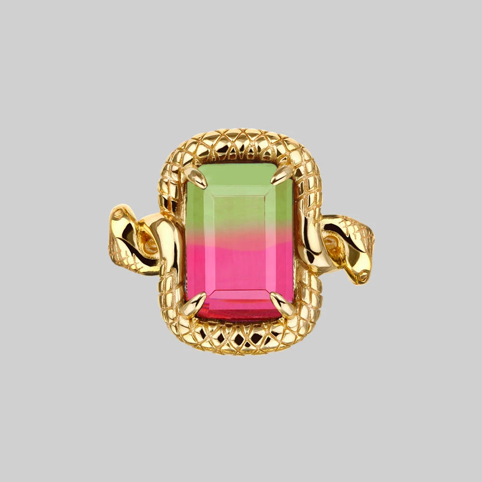 Two venomous snakes twist and twirl around a large rectangle cut Tourmaline CZ gemstone in this perfectly poised cocktail ring. A Black Friday Exclusive!