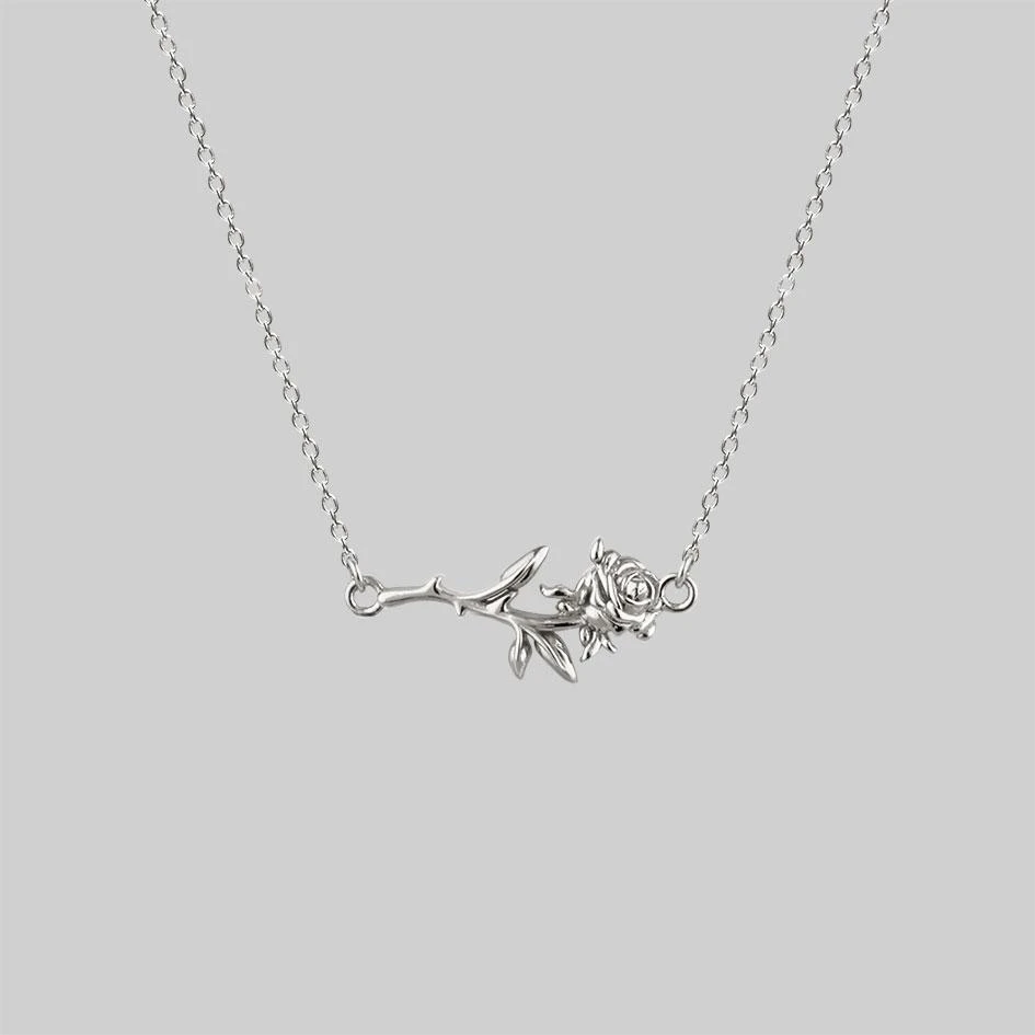 Intricate rose stem necklace with leaf detail, hangs suspended sideways on a delicate chain.