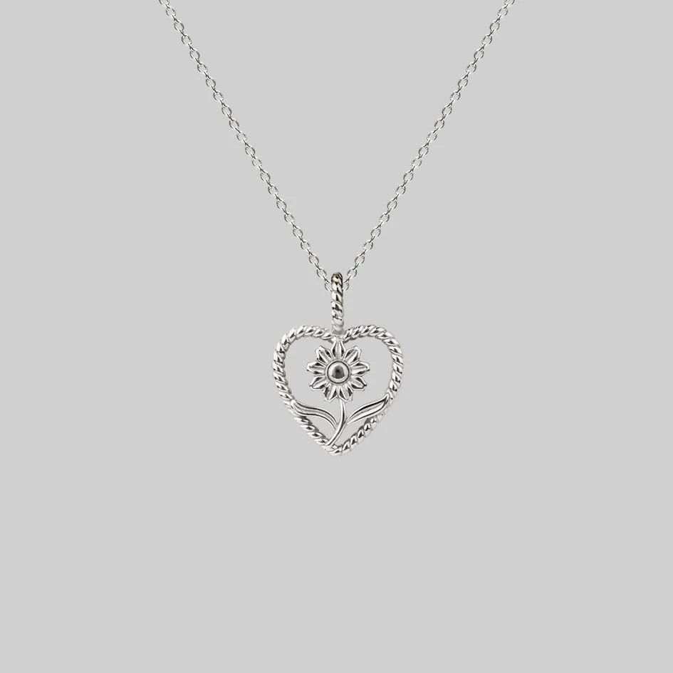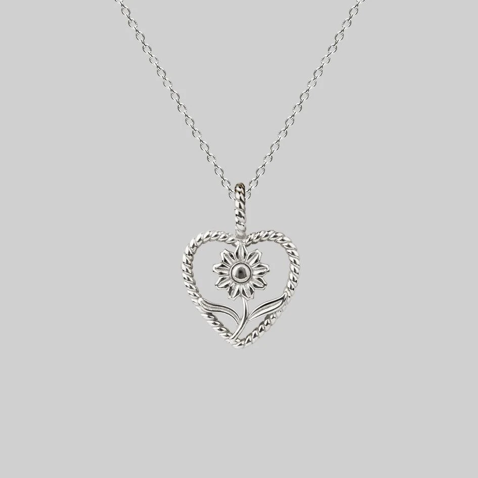 Heart framed sunflower with delicate twisted edge detail hangs from a delicate trace chain.