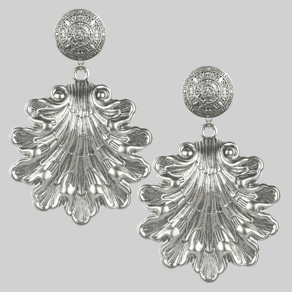 Huge oversized ornate clam shell earrings.