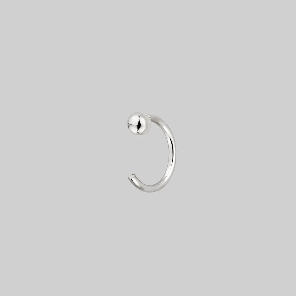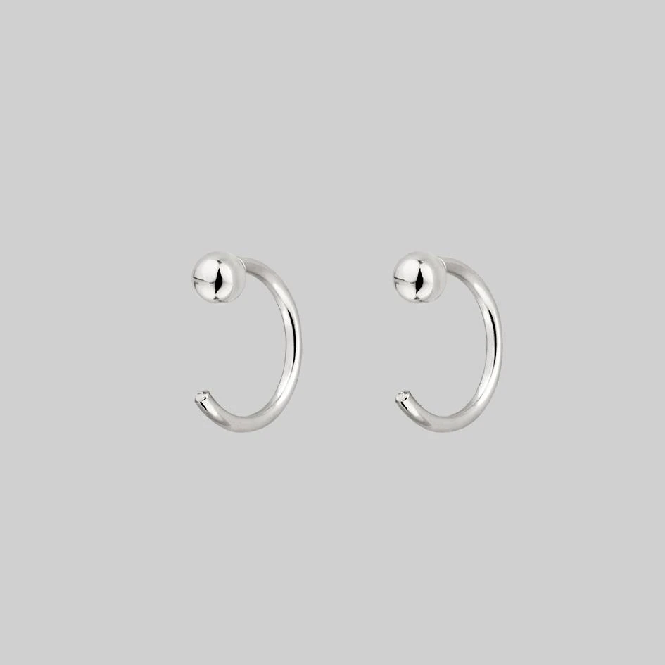 Simple silver ball huggie hoop earrings. Simply pull the open hoop through your piercing to the end. Slightly adjustable.