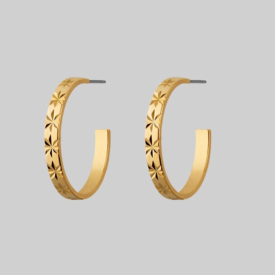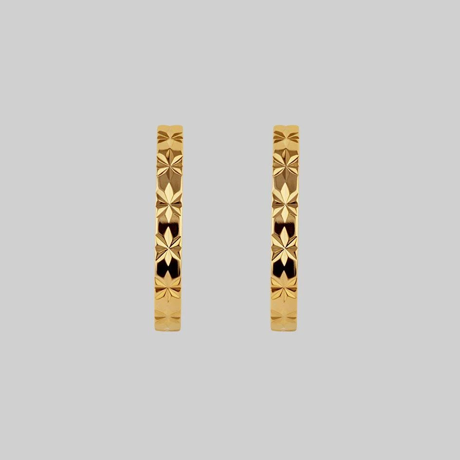 Gold hoop earrings featuring a delicate etched starburst pattern.