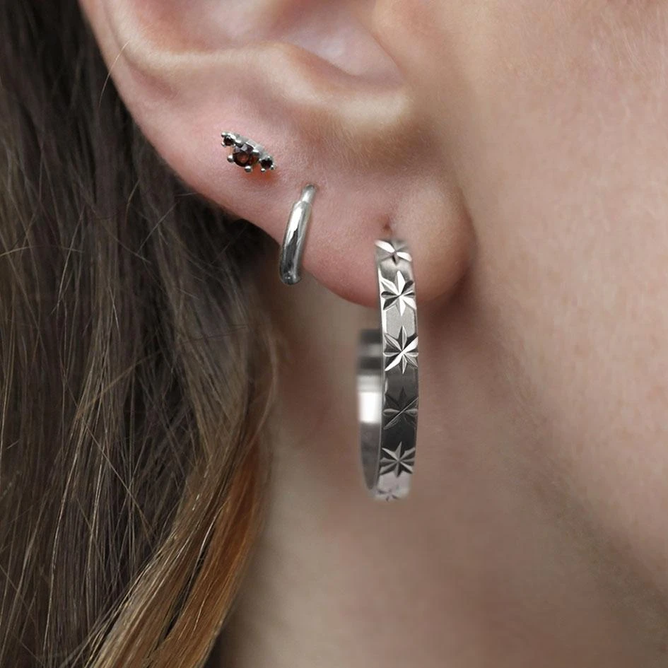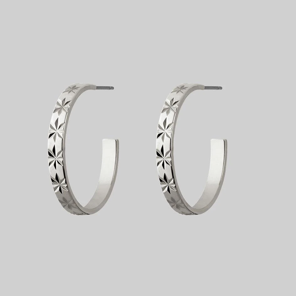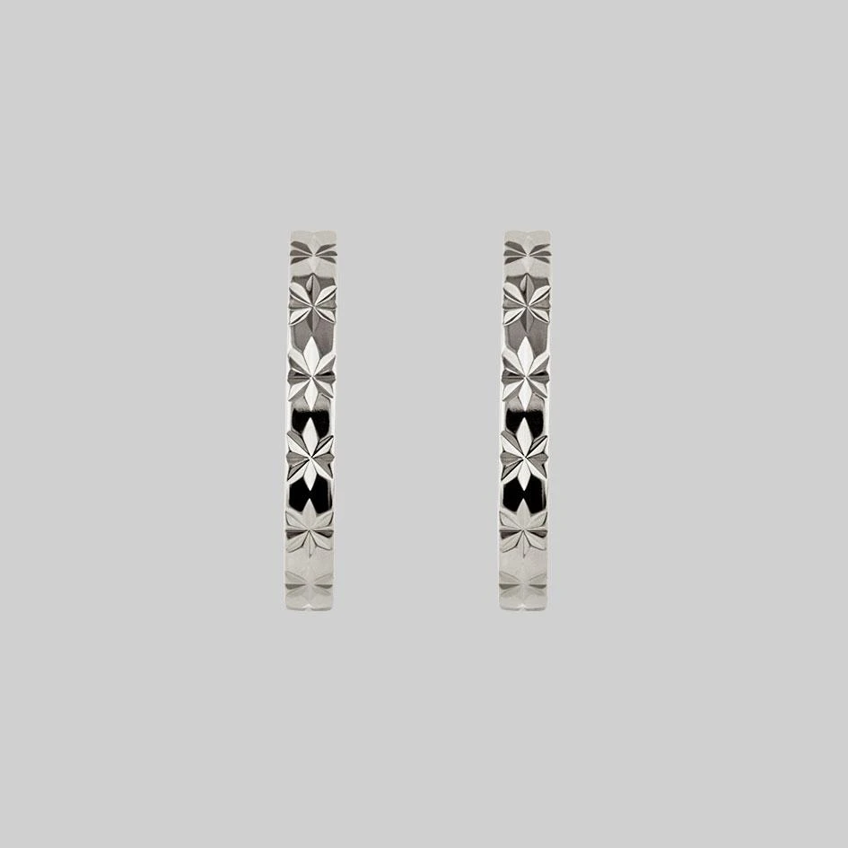 Silver hoop earrings featuring a delicate etched starburst pattern.