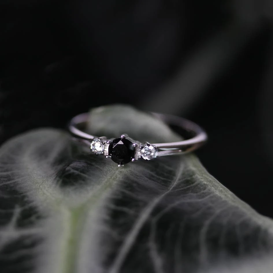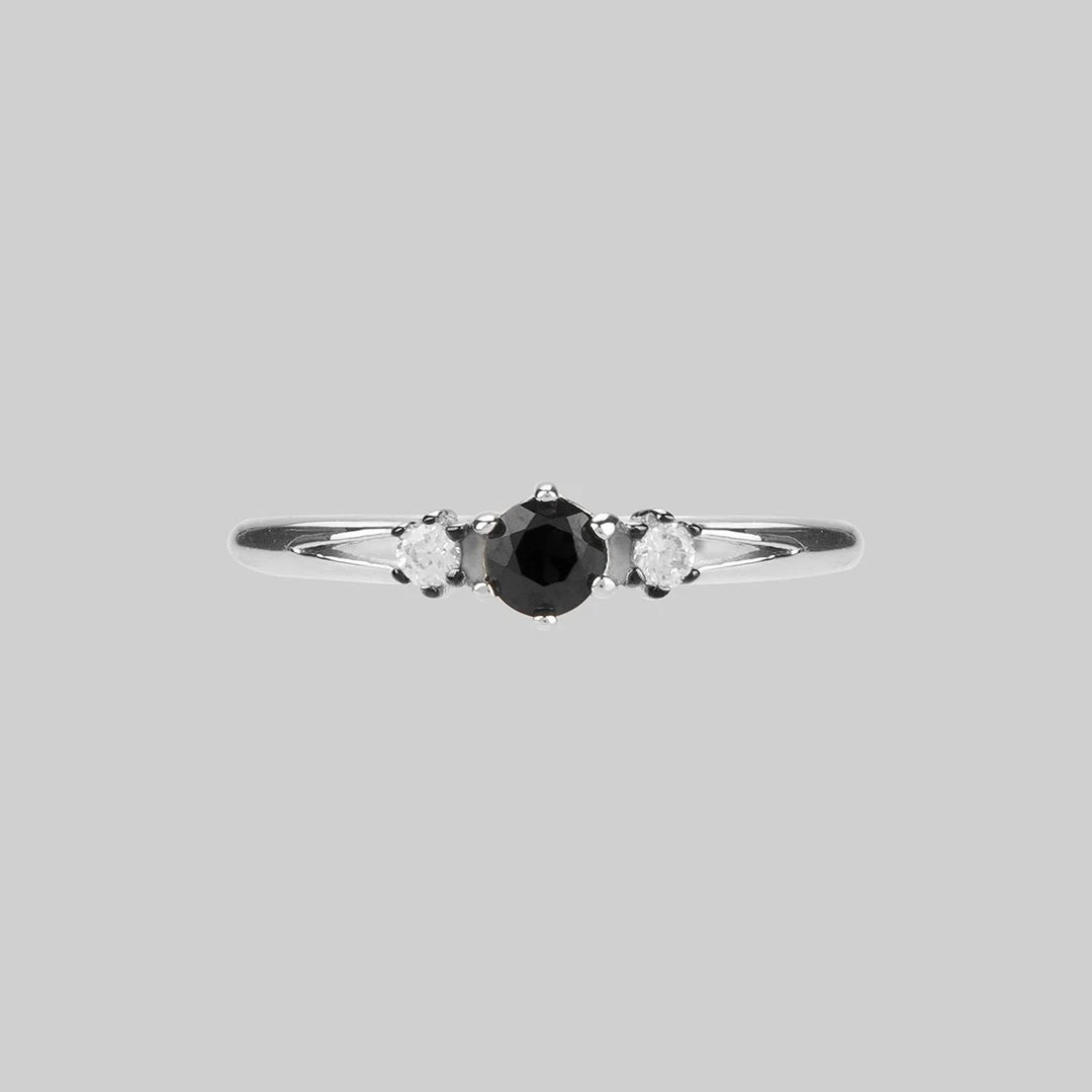 Vintage style Trilogy ring featuring a jet Black Spinel gemstone centre and a small Cubic Zirconia crystal either side. An understated, elegant ring.