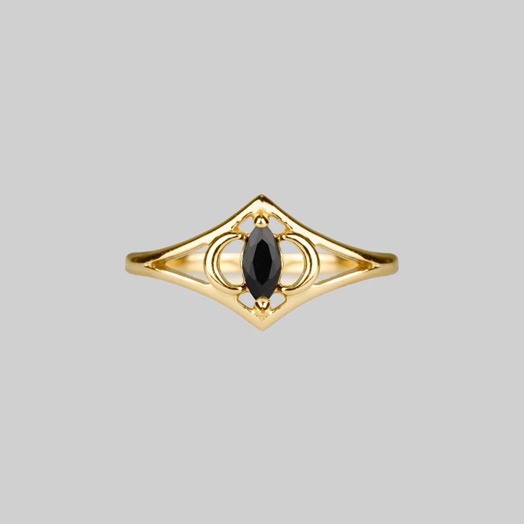 Inspired by the night’s celestial paths, two moon crescents sit either side of a Black Spinel gemstone within this symmetrical design.