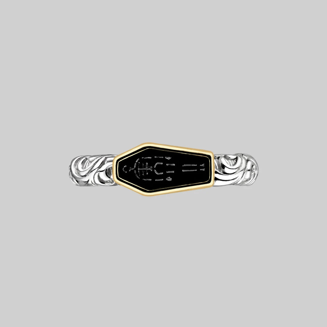 Ornate scroll detail mixed metal ring featuring a 3D coffin. Encapsulated behind a clear Resin lies a delicate skeleton. Inspired by Victorian Mourning Jewellery which was worn to express the sentiment of death.