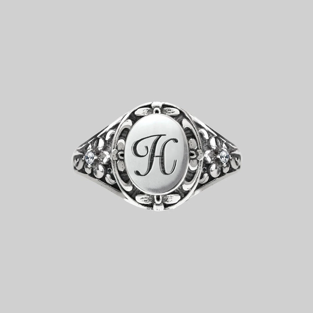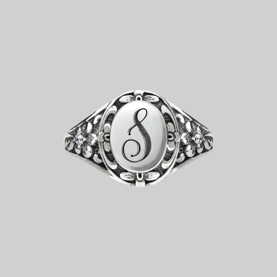 Ornate framed initial ring from Letters N – Z featuring two tiny Cubic Zirconia crystals encrusted within dark intricate detailing.