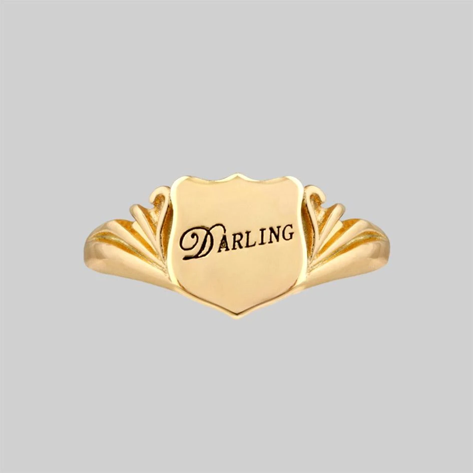 Vintage inspired signet ring with an ornate shield featuring the word Darling in a delicate gothic font.
