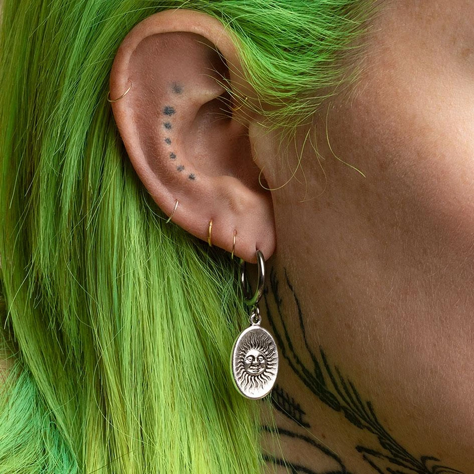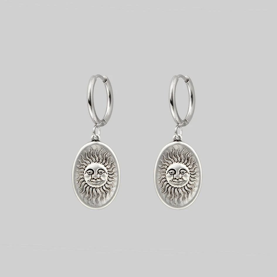 Celestial medallion sun hoop earrings with sweet little face detail.