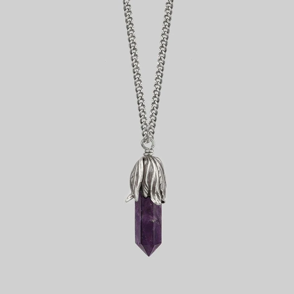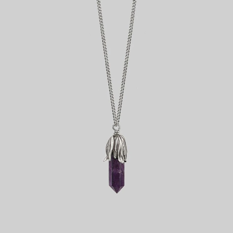 Amethyst gemstone shard encased within flourishing wild petals, hangs on a short adjustable chain.
