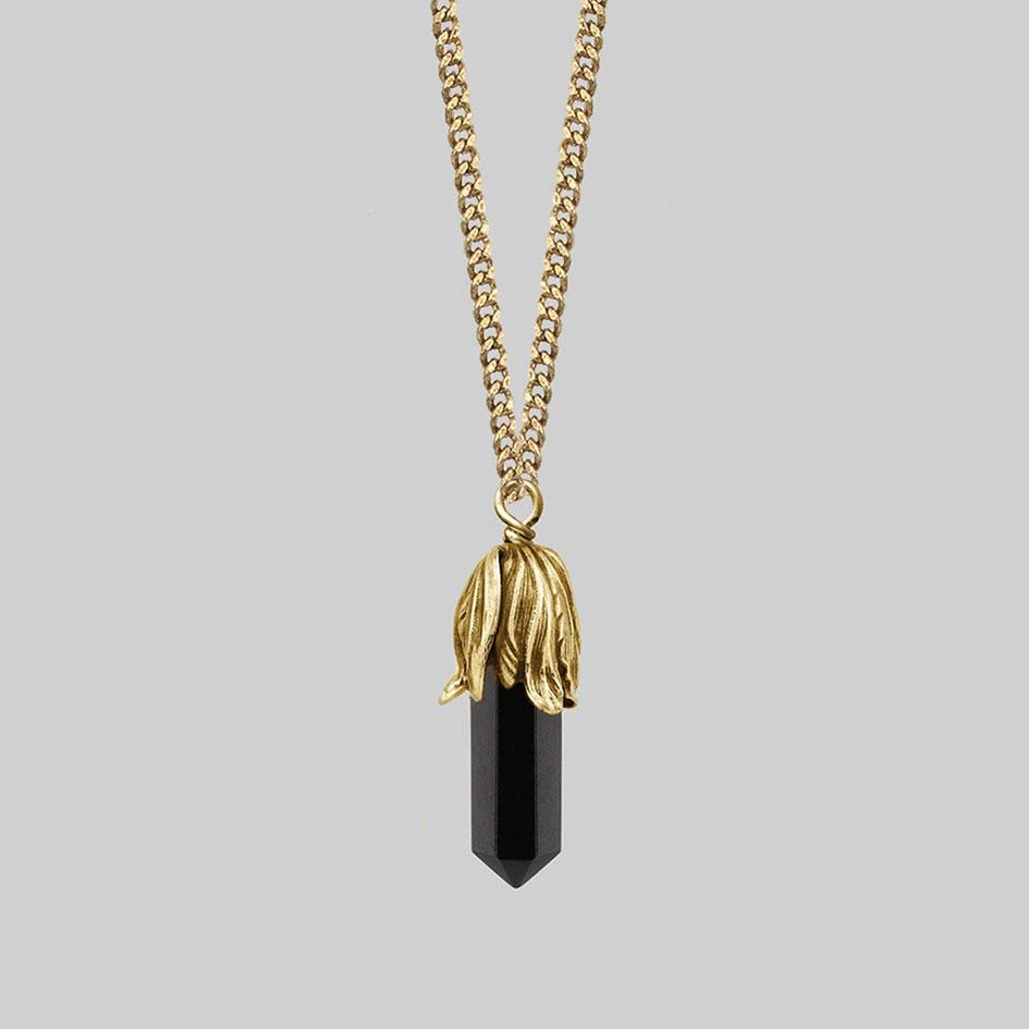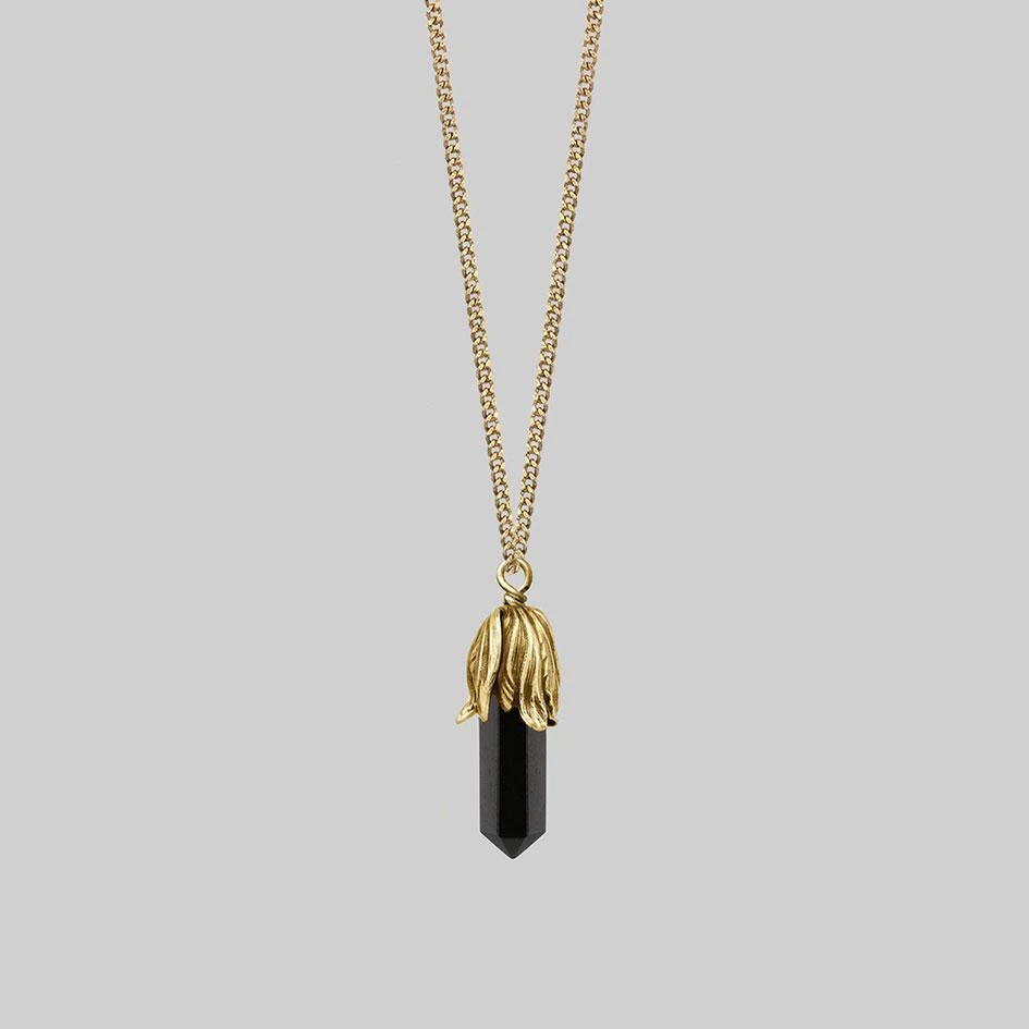 Black Agate gemstone shard encased within flourishing wild petals, hangs on a short adjustable chain.
