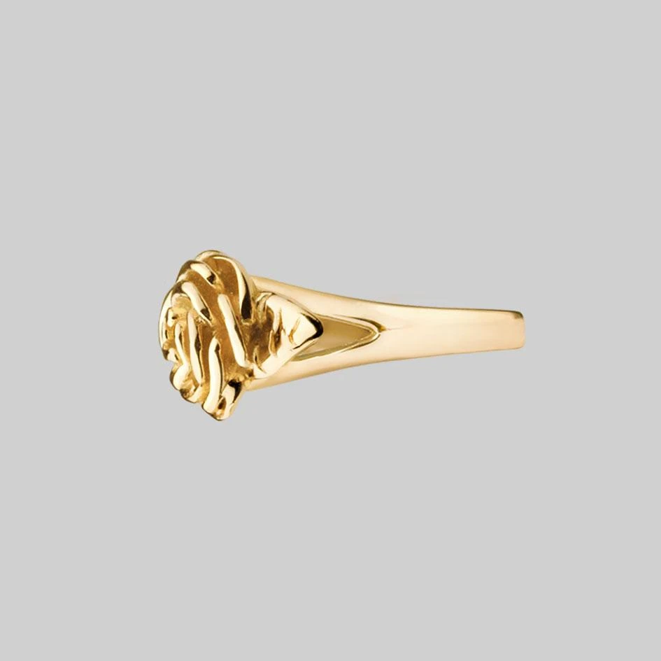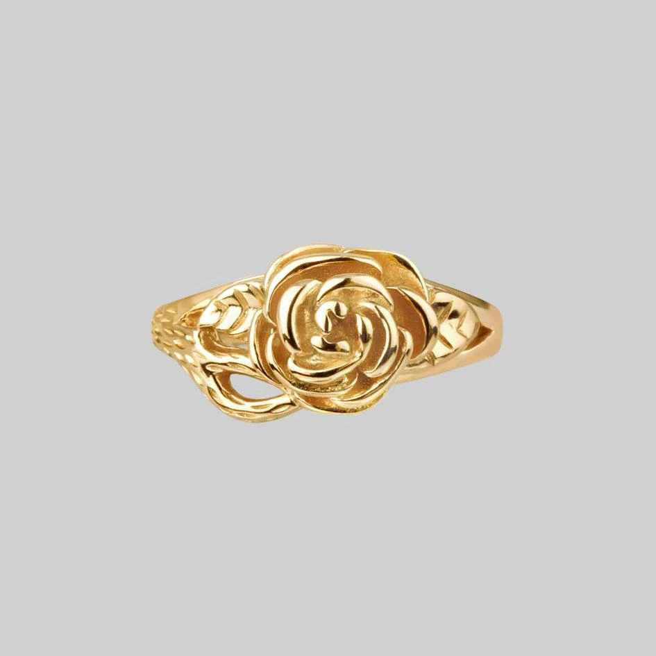 Gold ring featuring a very ‘Regal Rose’ with leaf and stem detailing.
