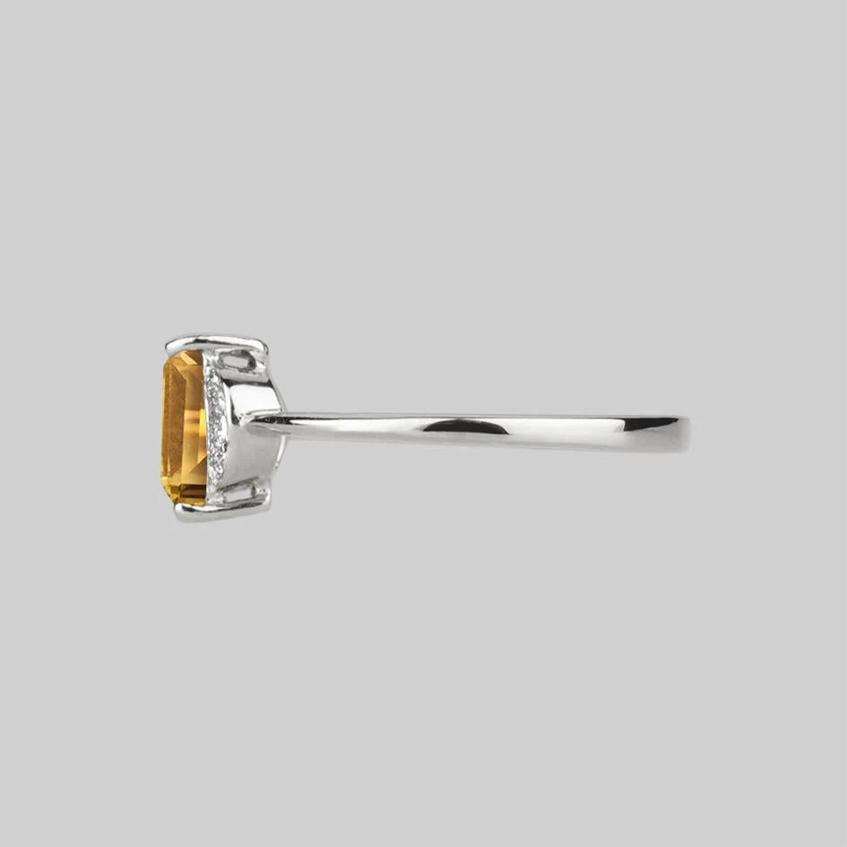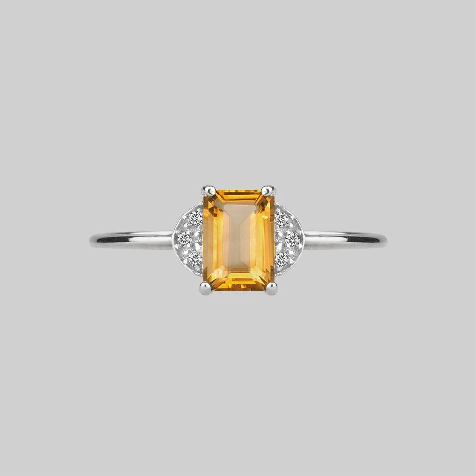 Inspired by Art Deco style this vintage style ring features decorative geometric symmetry. A claw set rectangular Citrine Quartz gemstone sits between two semi circles of Cubic Zirconia crystals.