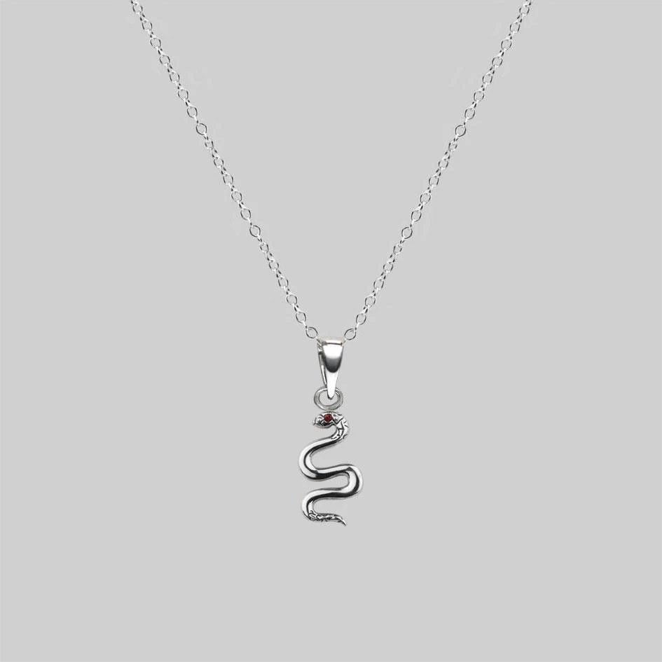 Delicate necklace featuring a tiny snake with deep red Garnet gemstone set eye.