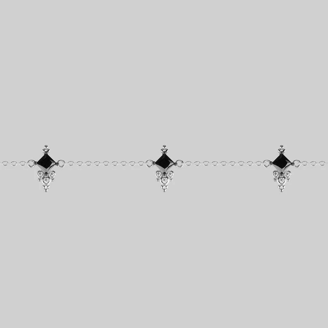 Sterling Silver chain choker featuring three diamond cut Black Spinel gemstones set amongst delicate detail and Cubic Zirconia crystal.