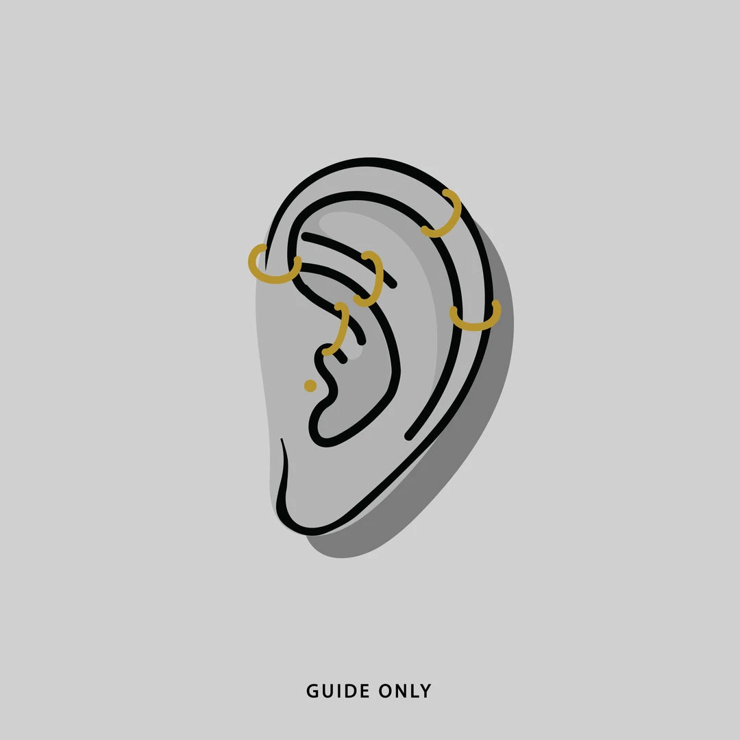 Everyone’s piercing location and ear shape are different! Ensure the internal diameter of the hoop will fit your desired piercing/position. Ask someone to help you measure the space of your desired location with a ruler. Jewellery for piercings is non exchangeable or returnable.
