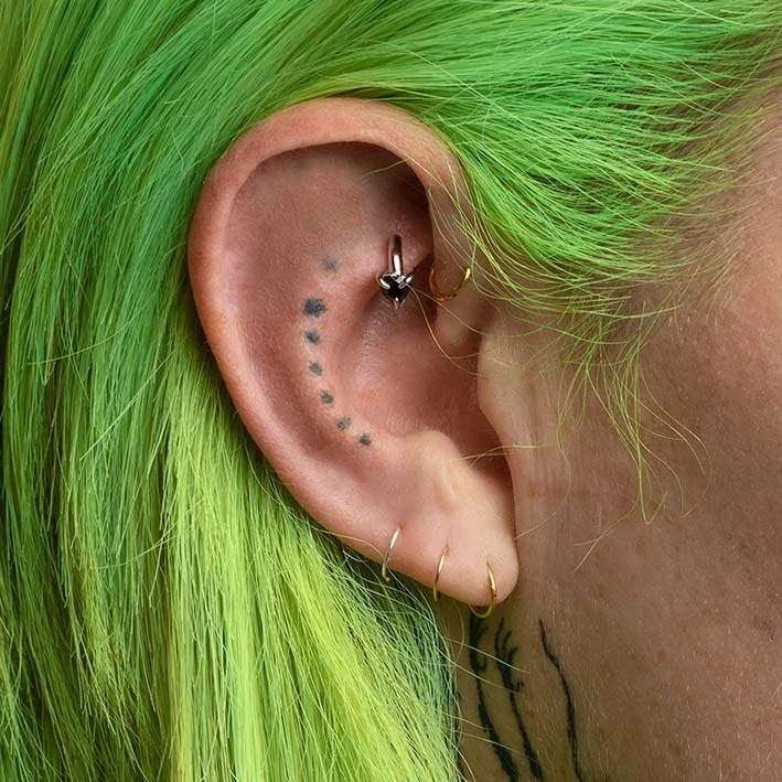 Can be worn in a forward helix, helix, rook, daith or tragus piercing.