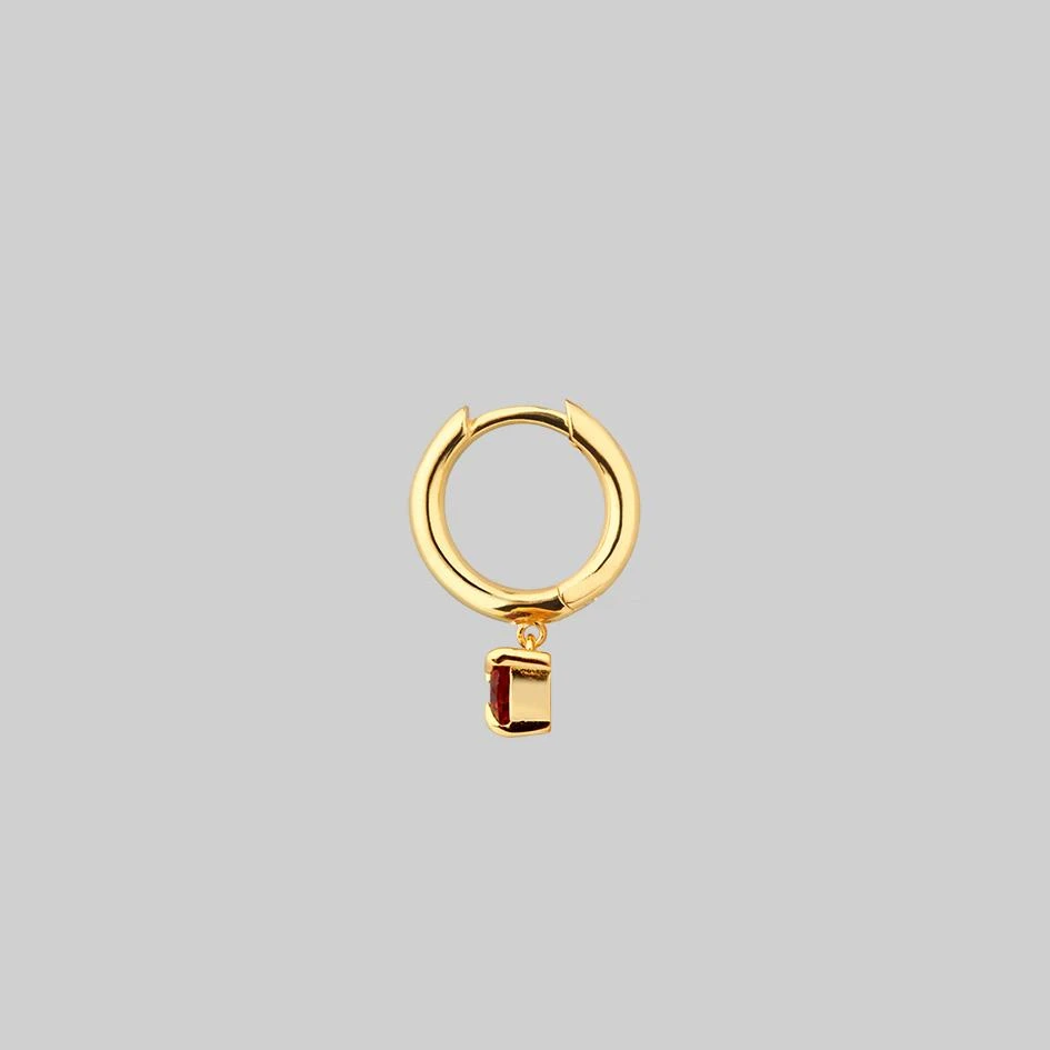 Gold clicker cartilage earring featuring a dangly Garnet gemstone heart set within claw shaped prongs.