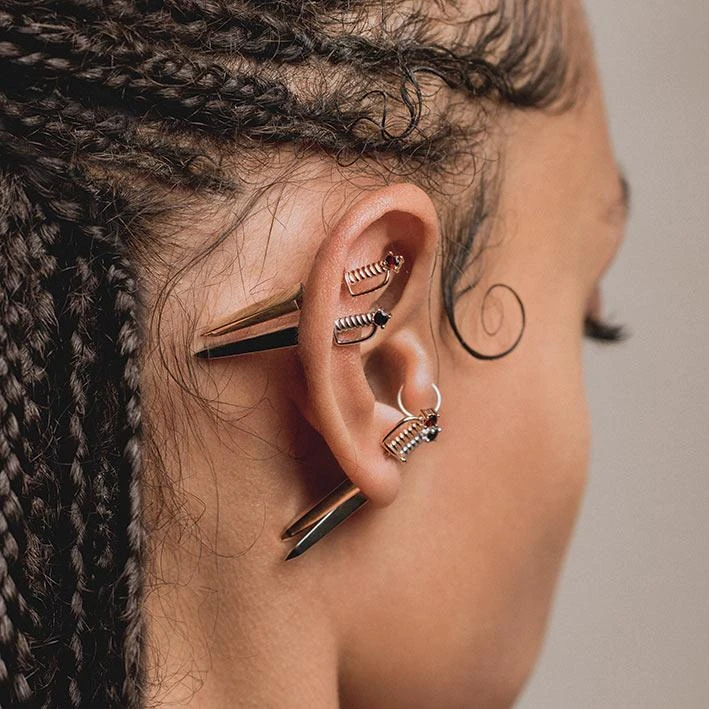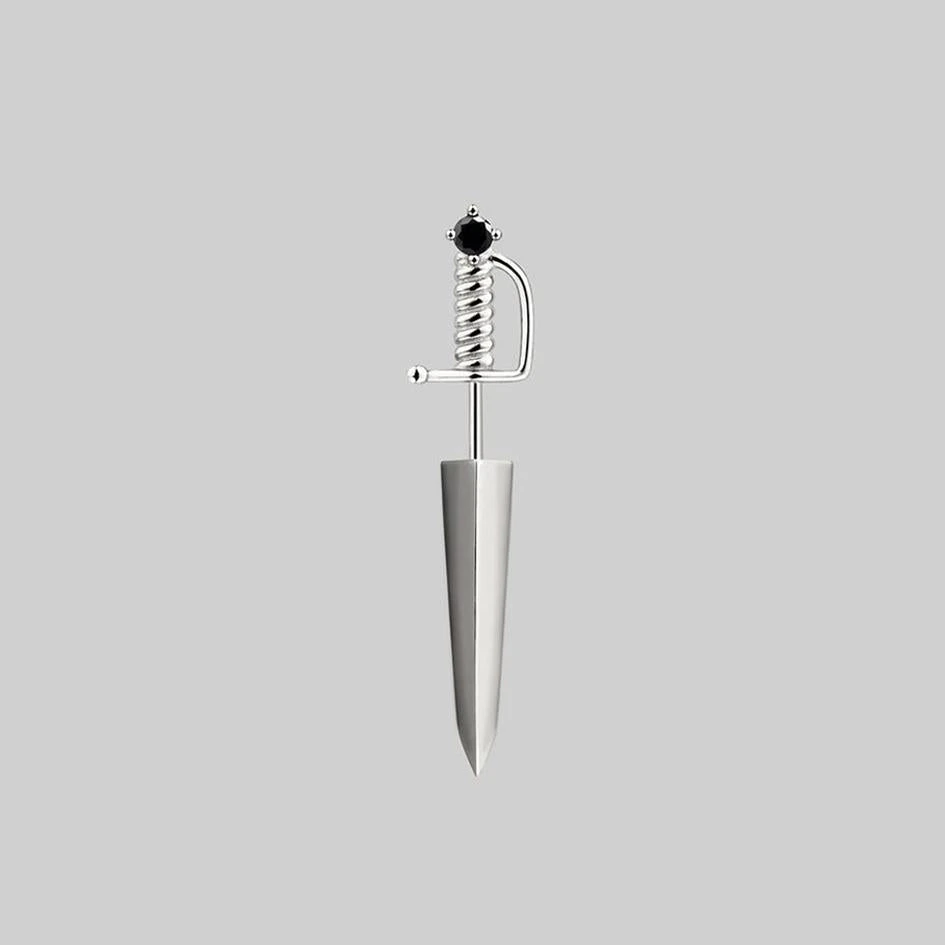 Fierce short dagger illusion single earring encrusted with a Black Spinel gemstone. For standard piercings.