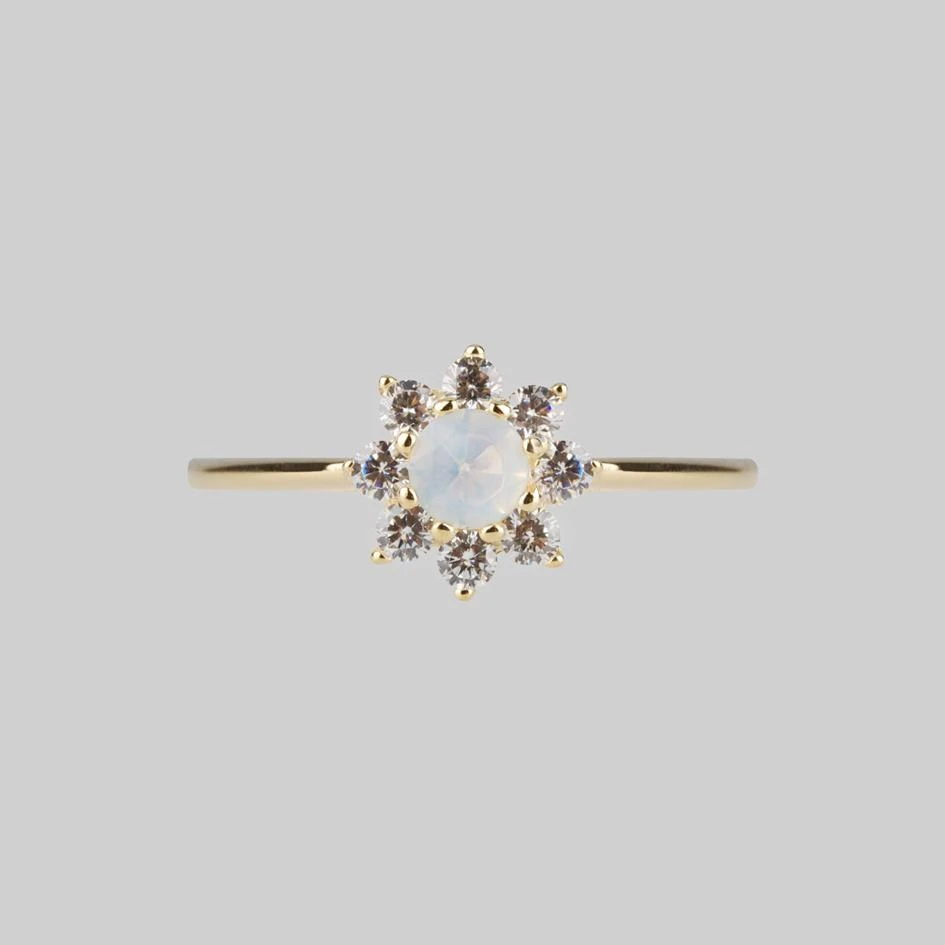 Classic vintage style cluster ring featuring a glowing cut Opal surrounded by sparkling Cubic Zirconia crystal. Simple, delicate and elegant.