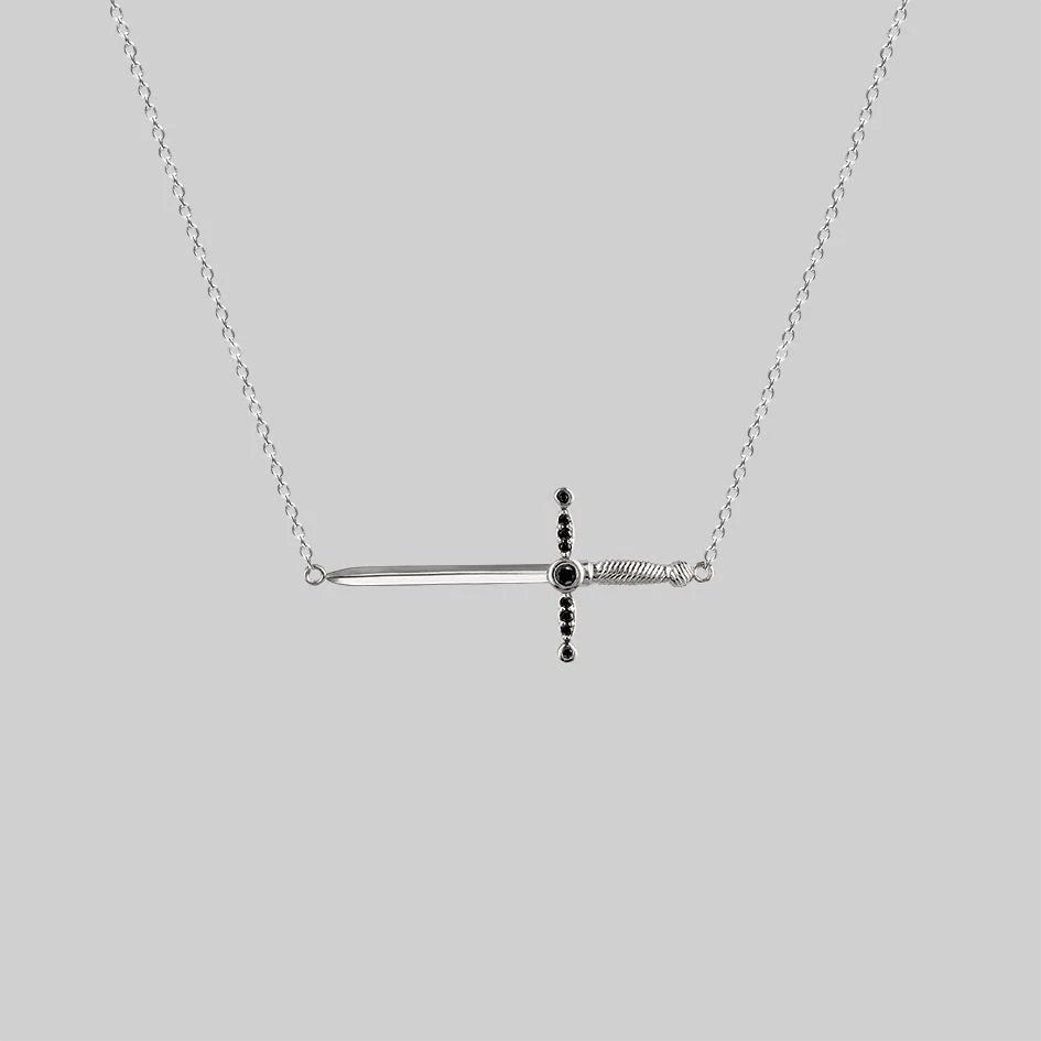 Black Spinel encrusted Deathly dagger necklace, suspended sideways.