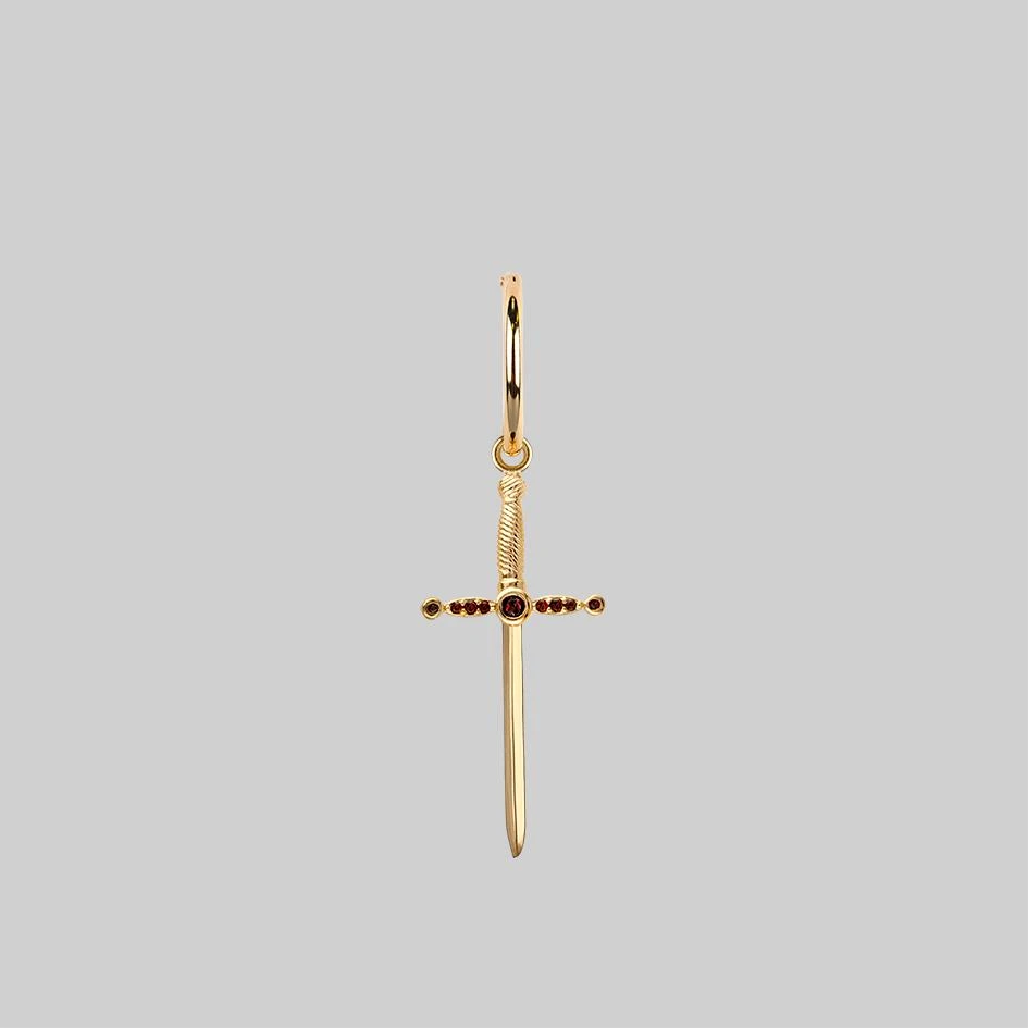 Deathly dagger hoop earrings encrusted with Garnet gemstones.