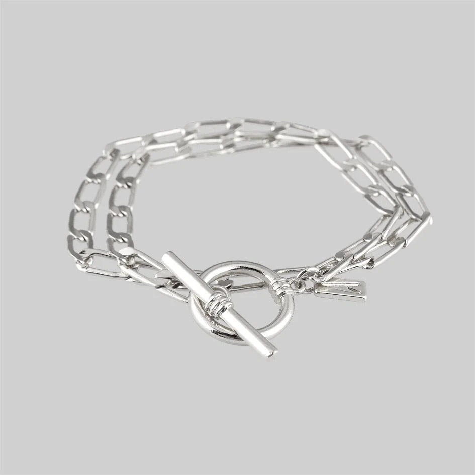 Double wrap layering curb chain bracelet featuring a T-Bar clasp.