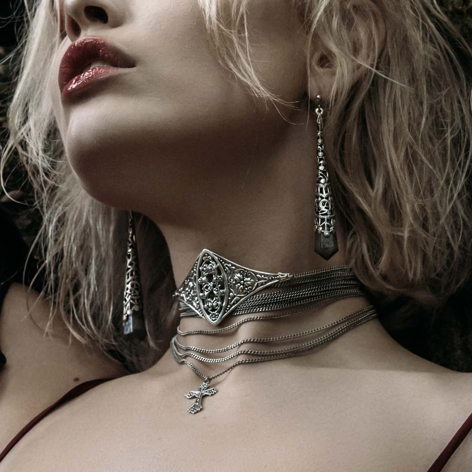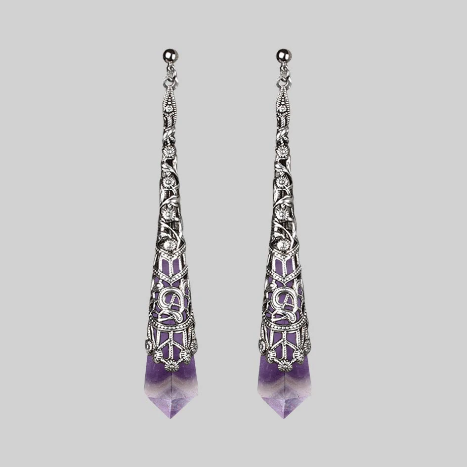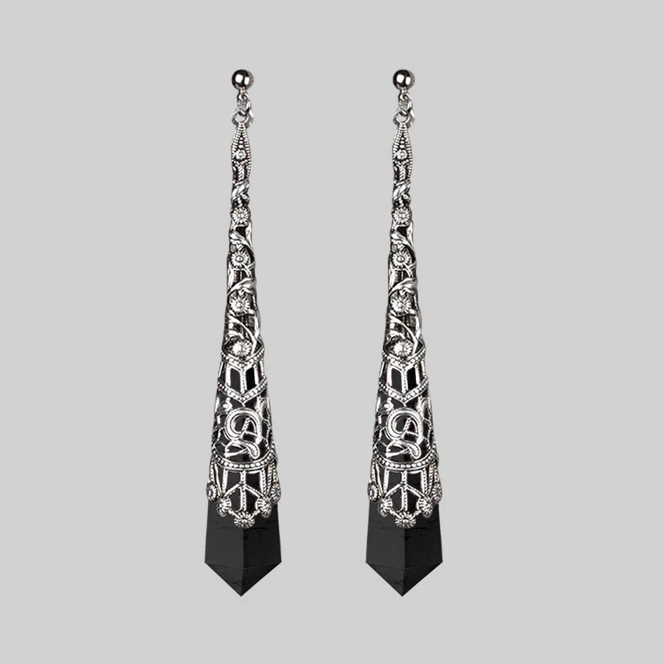 Silver filigree long drop gemstone earrings. Choose from Black Agate or Amethyst.