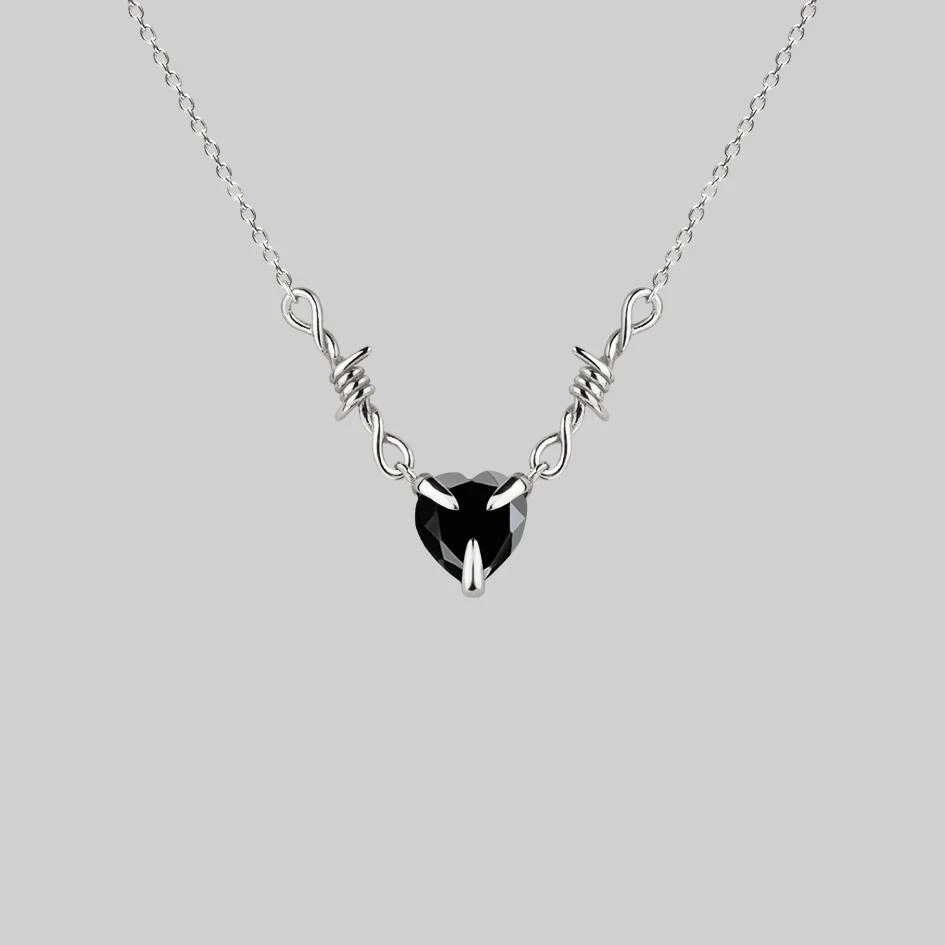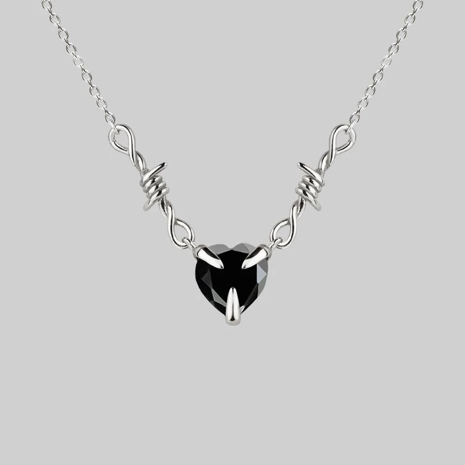 Elegant and deadly. Silver barbed wire necklace with a central Black Onyx gemstone heart set within claw shaped prongs. Hangs from a delicate trace chain.
