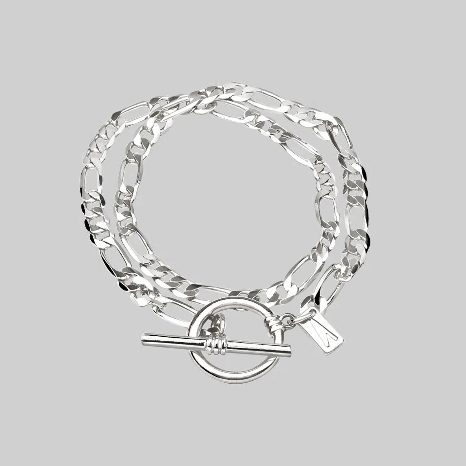 Silver double wrap curb chain bracelet featuring a T-Bar clasp.