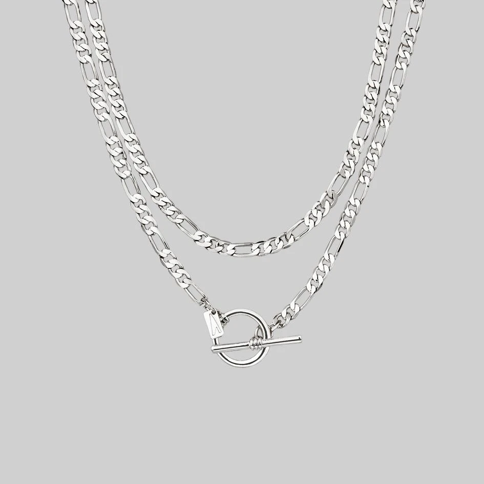 Silver double wrap curb chain necklace featuring a T-Bar clasp.