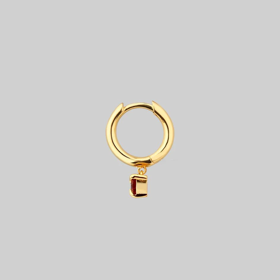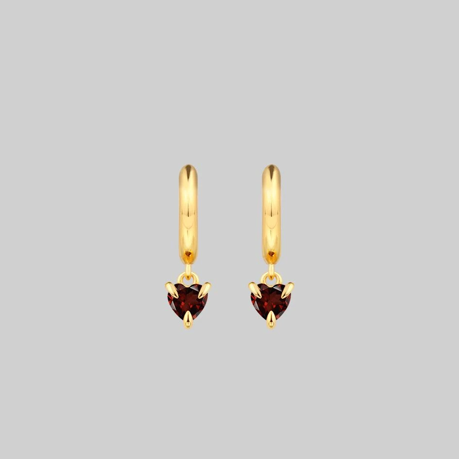 Gold clicker hoop charm earrings featuring a dangly Garnet gemstone heart set within claw shaped prongs.