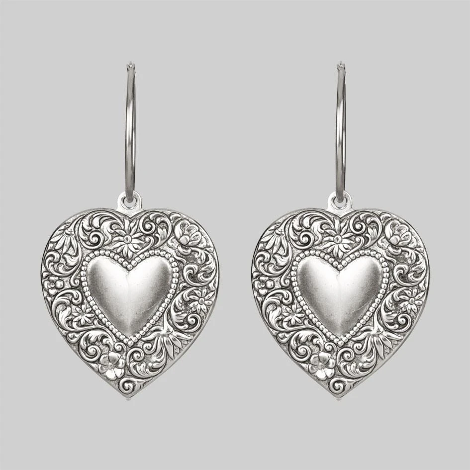 Huge ornate heart hoop earrings.