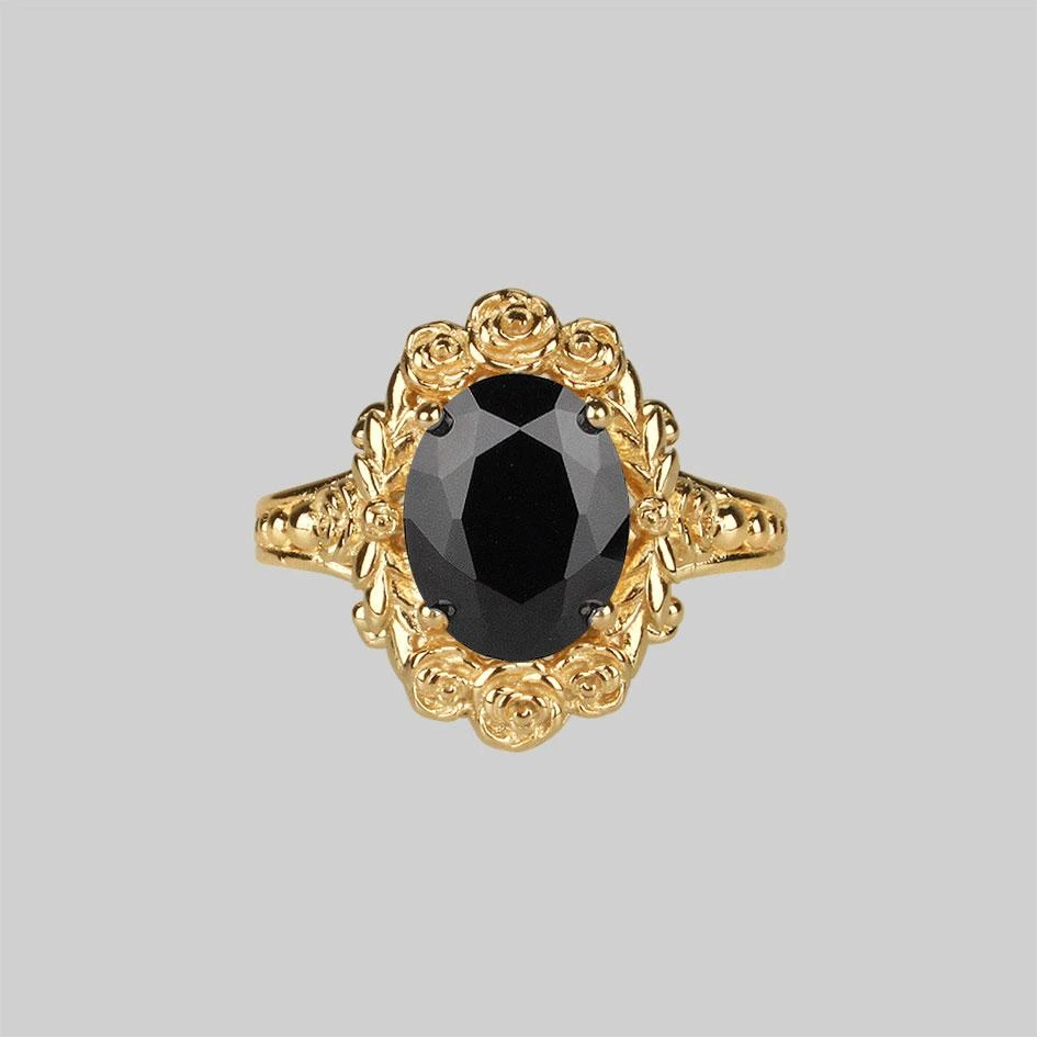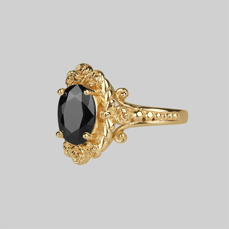 Luxurious vintage inspired cocktail ring featuring a large faceted Onyx gemstone set upon a ornately detailed split shank within a rose wreath frame.