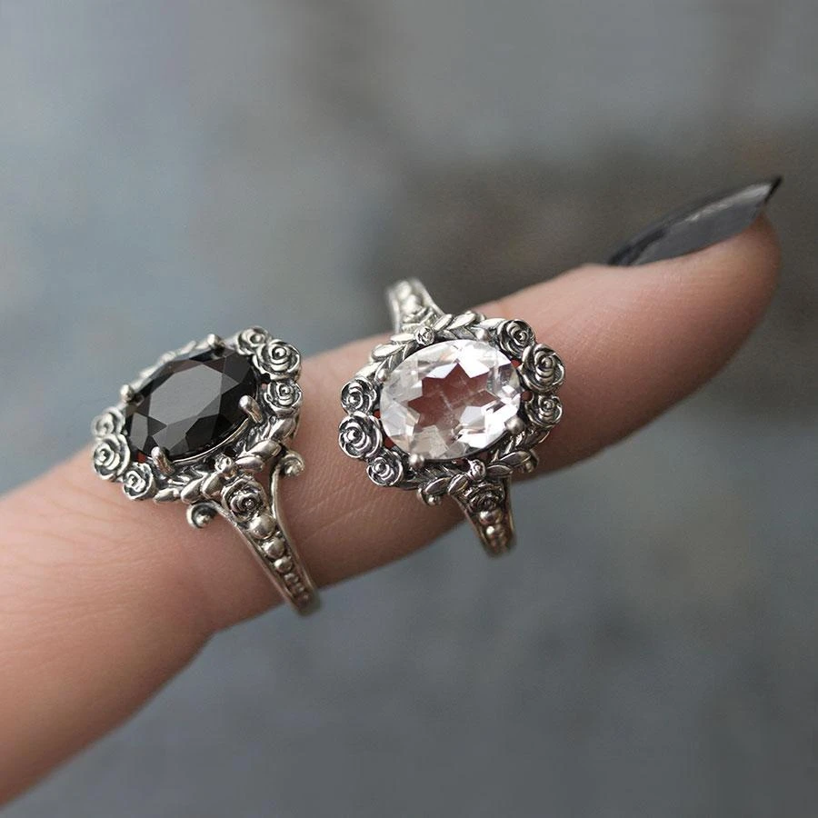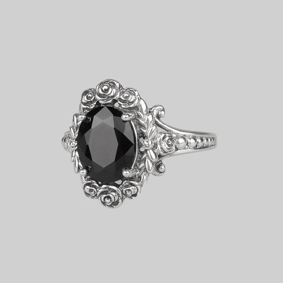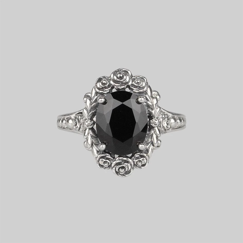 Luxurious vintage inspired ring featuring a large faceted Onyx gemstone set upon a ornately detailed split shank within a rose wreath frame.