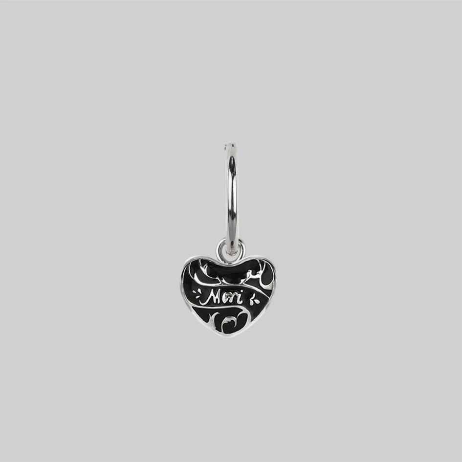 Deadly sweet black enamel hearts displaying the word ‘Mori’ in tiny script font. Inspired by the medieval practise of reflection on morality – ‘Memento Mori’ is a reminder to live and in Latin translates as “remember that you have to die”.
