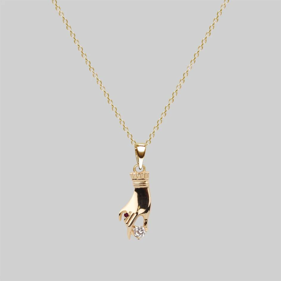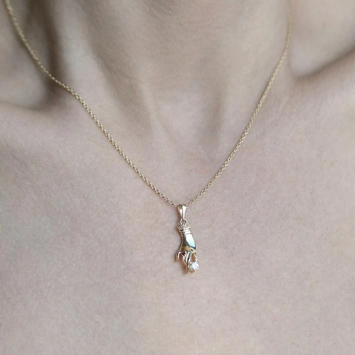 Victorian inspired necklace featuring a slender hand pinching a single sparkling Cubic Zirconia crystal. The hand features delicate lace cuff details and a deep Garnet gemstone ring.