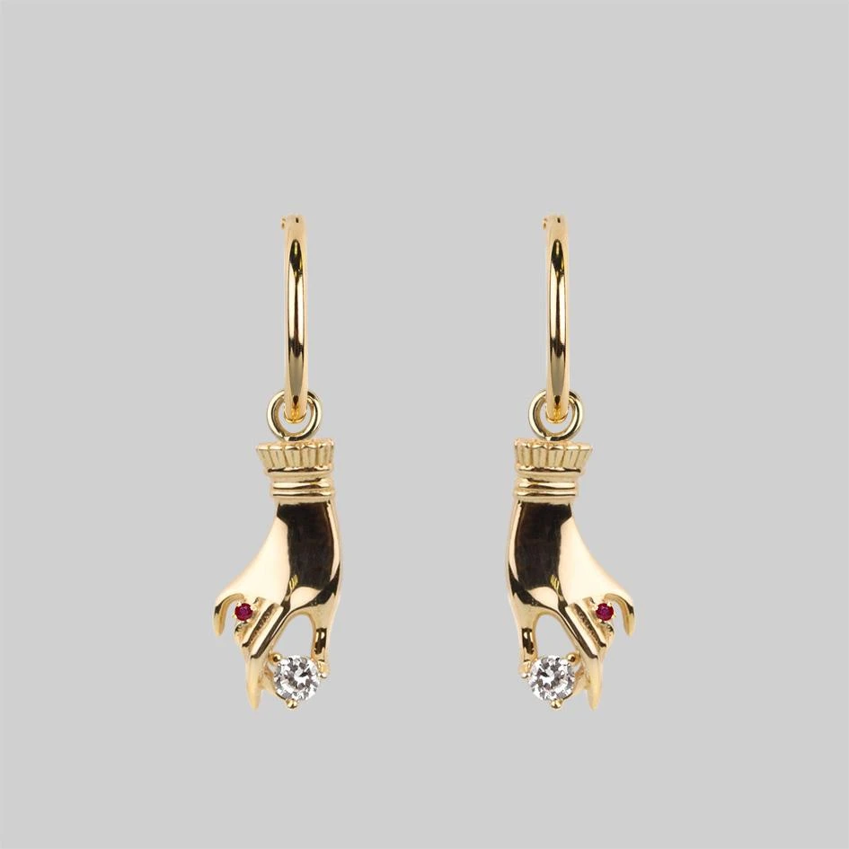 Victorian inspired slender hand pinching a single sparkling Cubic Zirconia crystal. Each hand features a delicate lace cuff detail and a deep red Garnet gemstone ring.