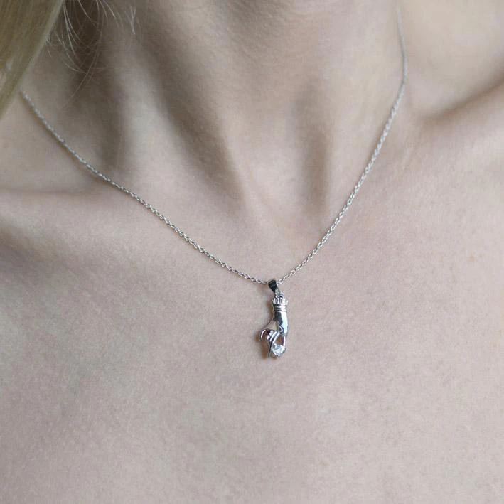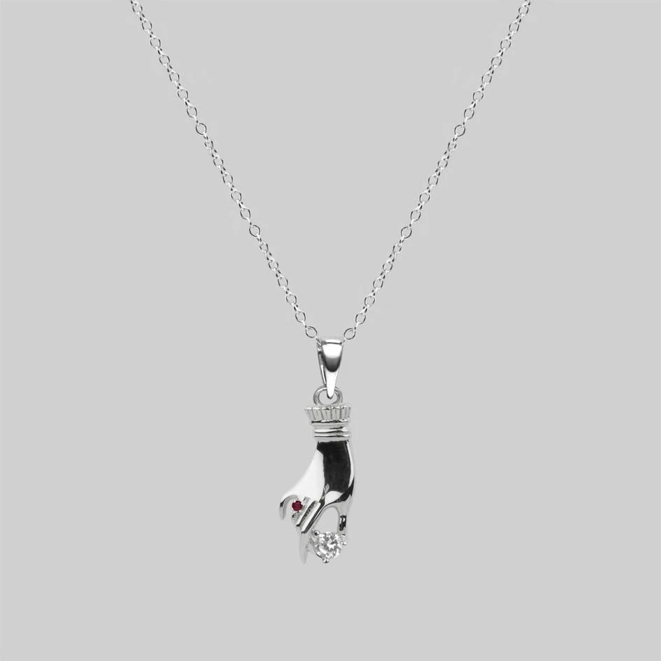 Victorian inspired necklace featuring a slender hand pinching a single sparkling Cubic Zirconia crystal. The hand features delicate lace cuff details and a deep Garnet gemstone ring.